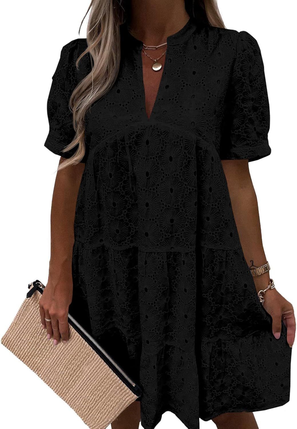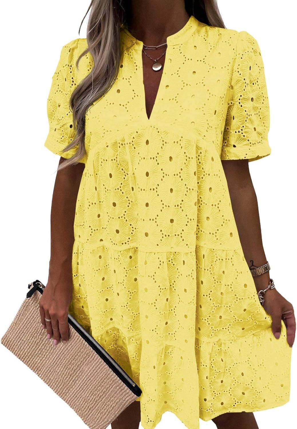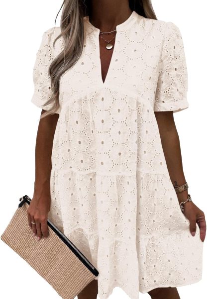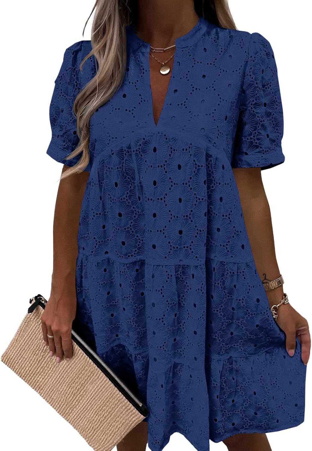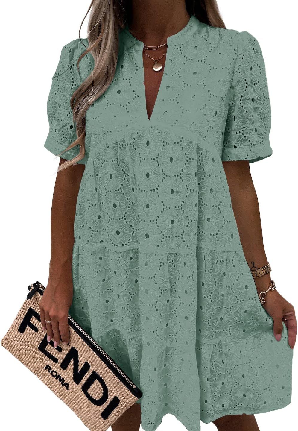 Imily Bela Womens Lace Eyelet Casual V Neck Tunic Dress